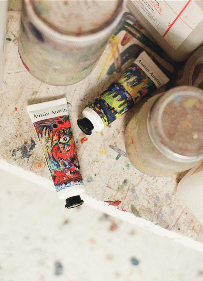 Austin Austin collaborates with artists for their product packaging and branding. This collaboration allows the company to support and showcase the work of talented artists and also allows the bottles to be a mini work of art for your bathroom.