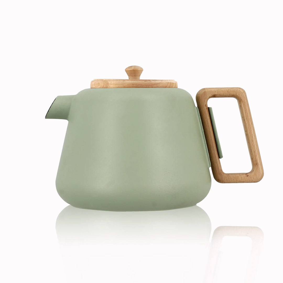 1000ml cast iron tea pot with modern styling including an almond green matte finish with a wooden handle and lid. The use of cast iron is a nod towards traditional French heritage but also means your tea will stay warm for longer. Suitable for use on the stove top (ceramic, electric or induction), the wooden handle is very practical, keeping cool even when the teapot is hot. The teapot is equipped with a micro-perforated stainless steel strainer to allow your loose leaf tea to diffuse and brew.