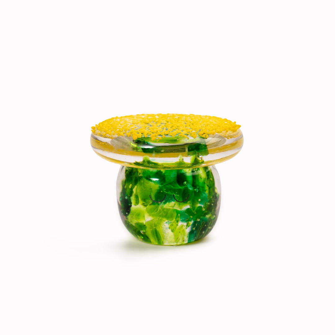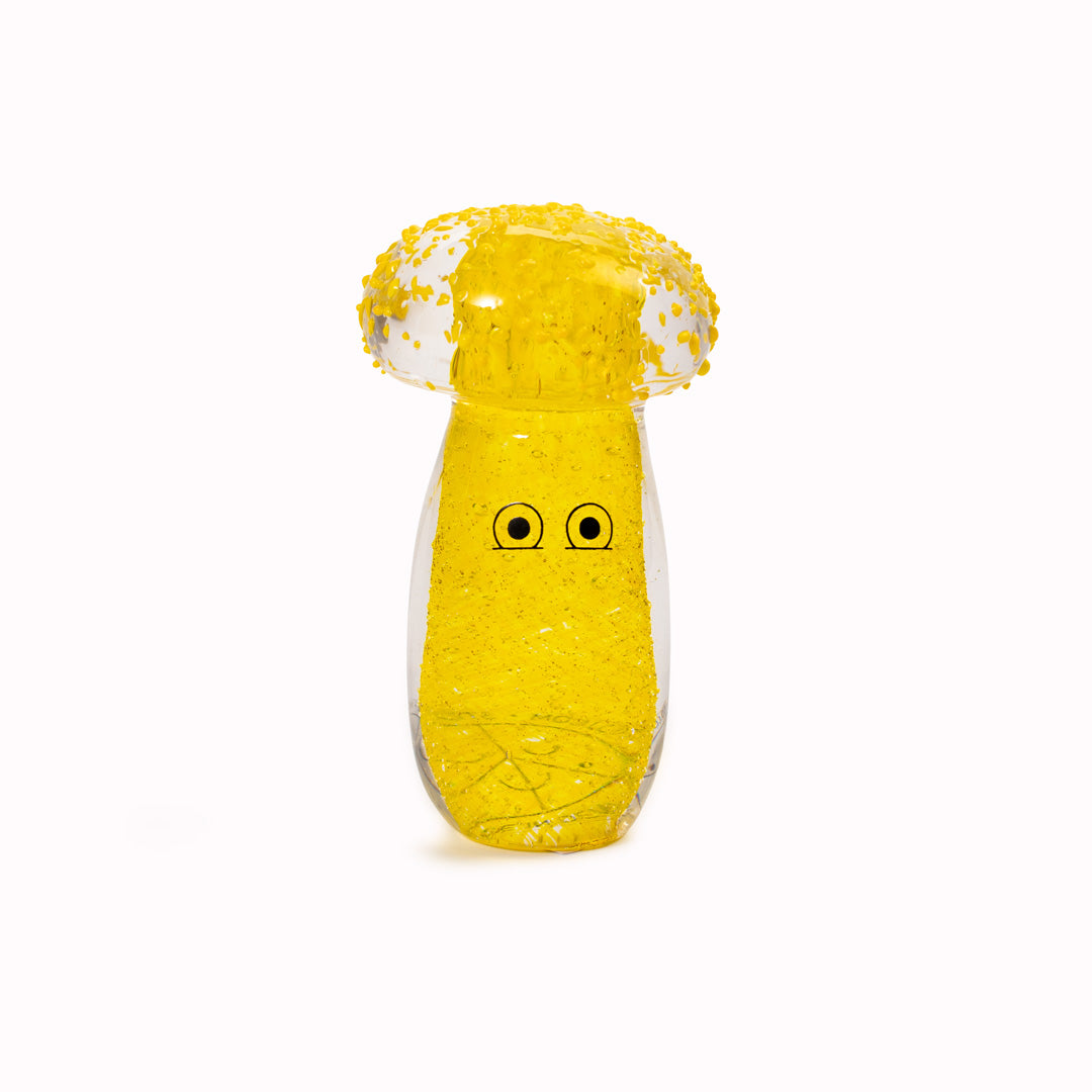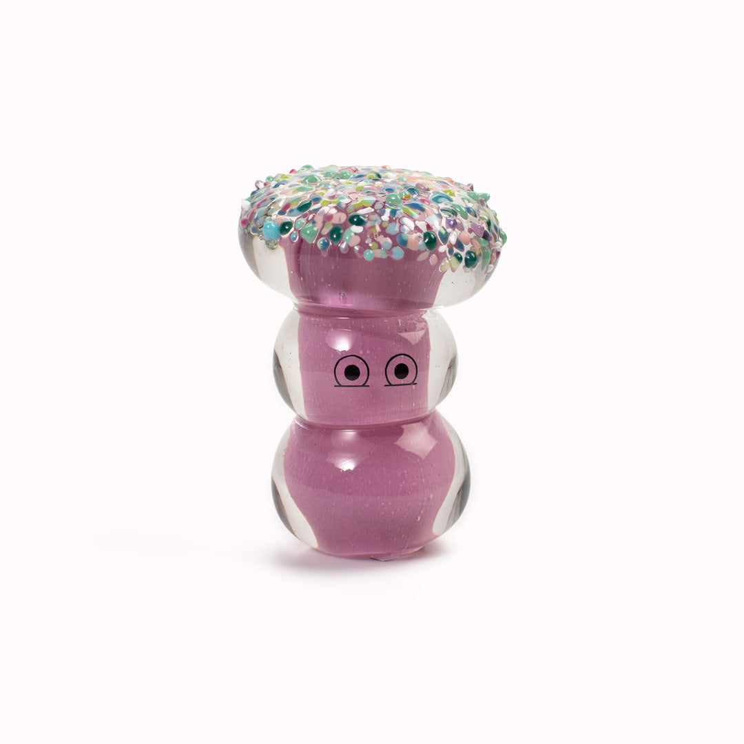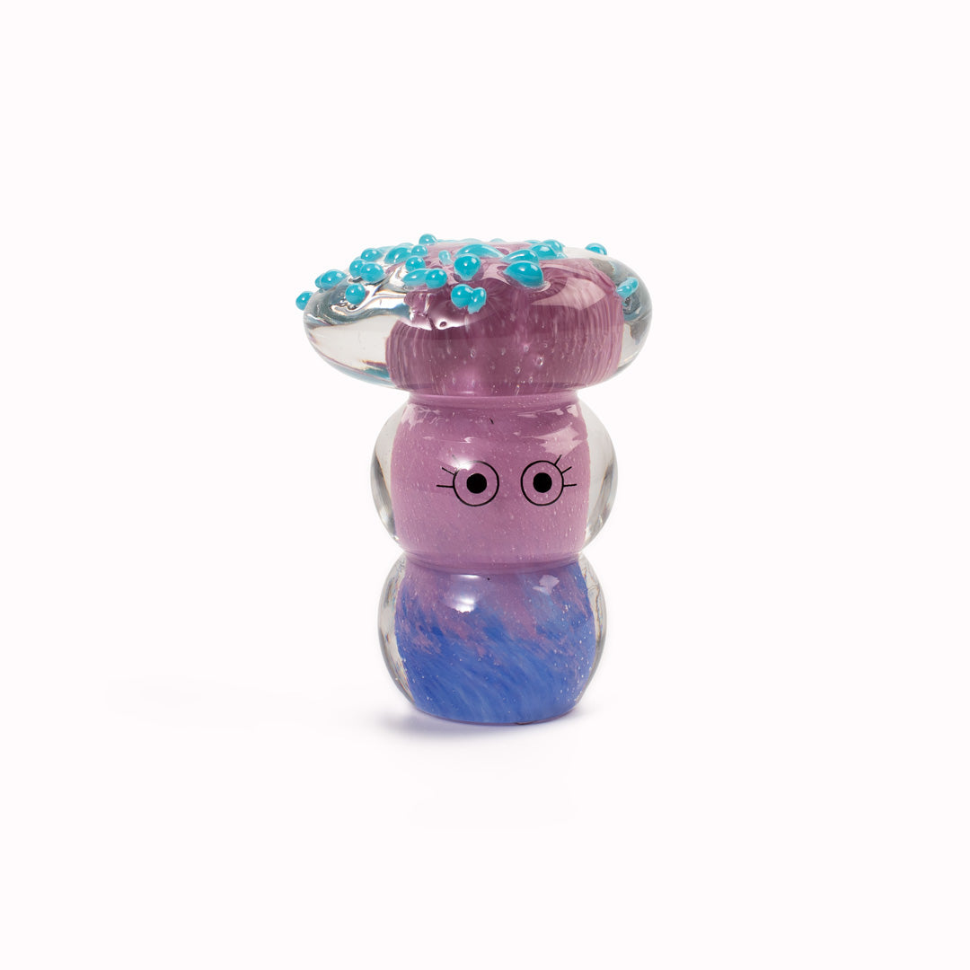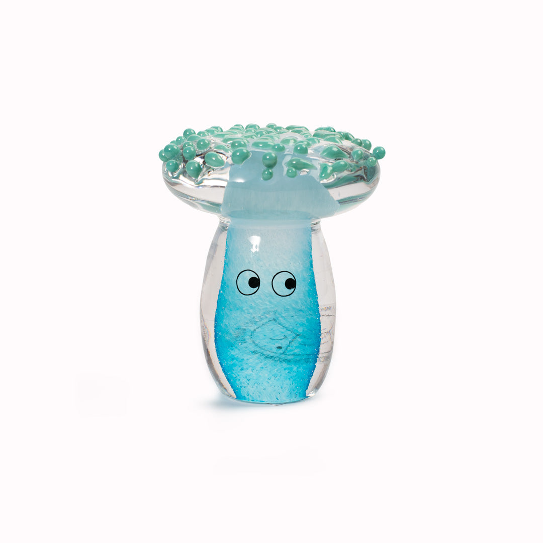 Speckled Shroom Crystal Blob is formed by dipping and/or rolling molten (hot!) clear glass into smaller chunks of brightly coloured glass droplets, then expertly shaping into weird and wonderful forms.