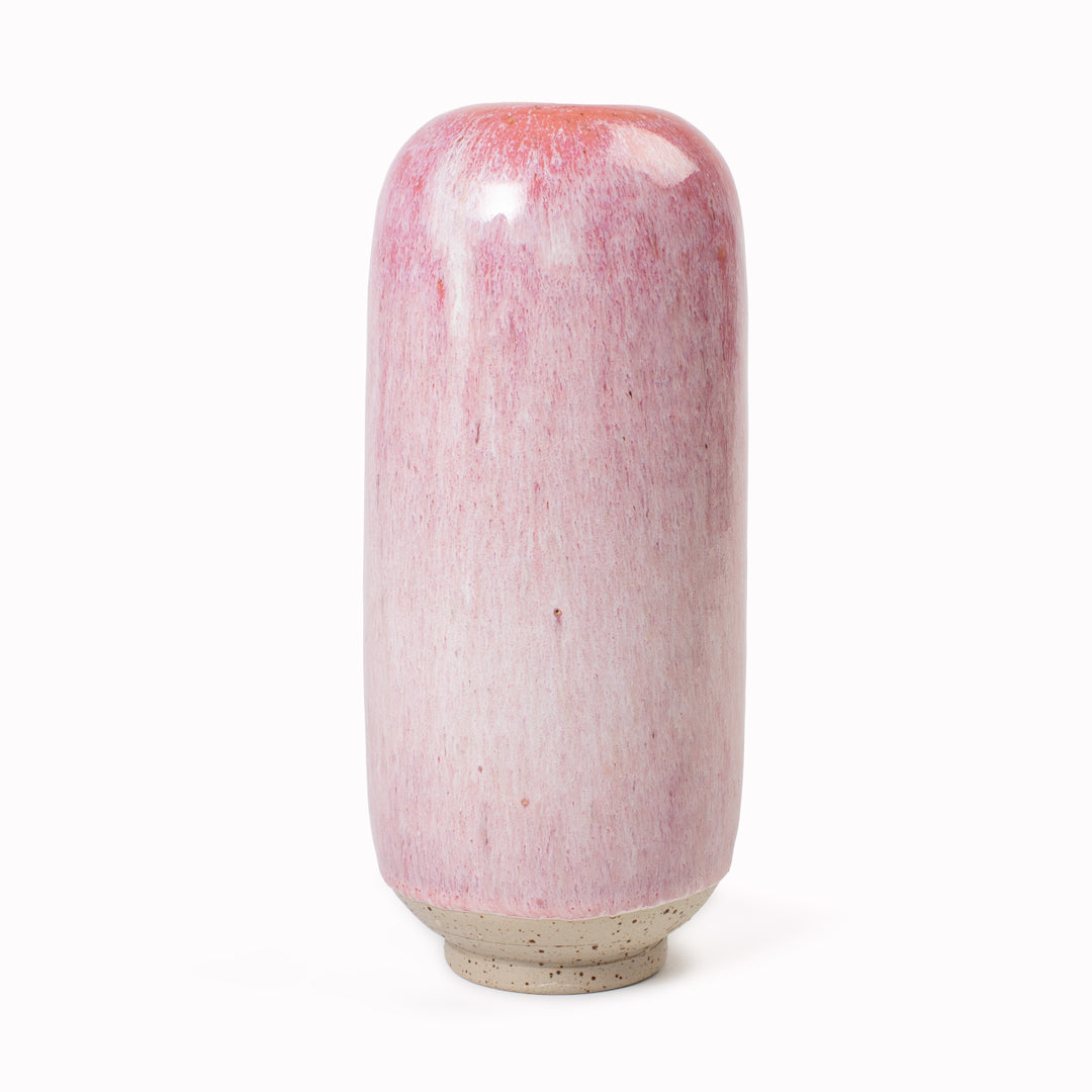 The white drip glaze over pink, Melting Milkshake design is hand-thrown in watertight stoneware. Due to the rounded taper at the top of the vase, the glaze melts down the sides of the cylindrical vase mimicking melting ice.
