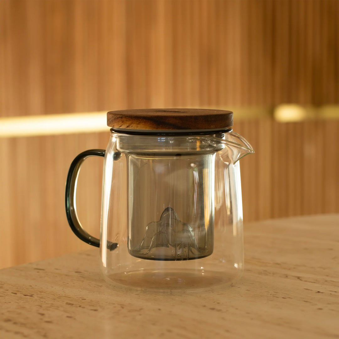 Elegant and contemporary glass teapot made from borosilicate glass with graphite grey coloured glass strainer and handle, by French brand Ogo Living. Topped with Acacia wood lid to keep your tea warm while it brews. The teapot works best with loose leaf tea and features a grey coloured glass strainer which provides space for the tea leaves to unfurl for a perfectly brewed hot drink. Simply add loose leaf tea to the strainer, top with hot water, place the lid on top and allow to brew according to your preference.